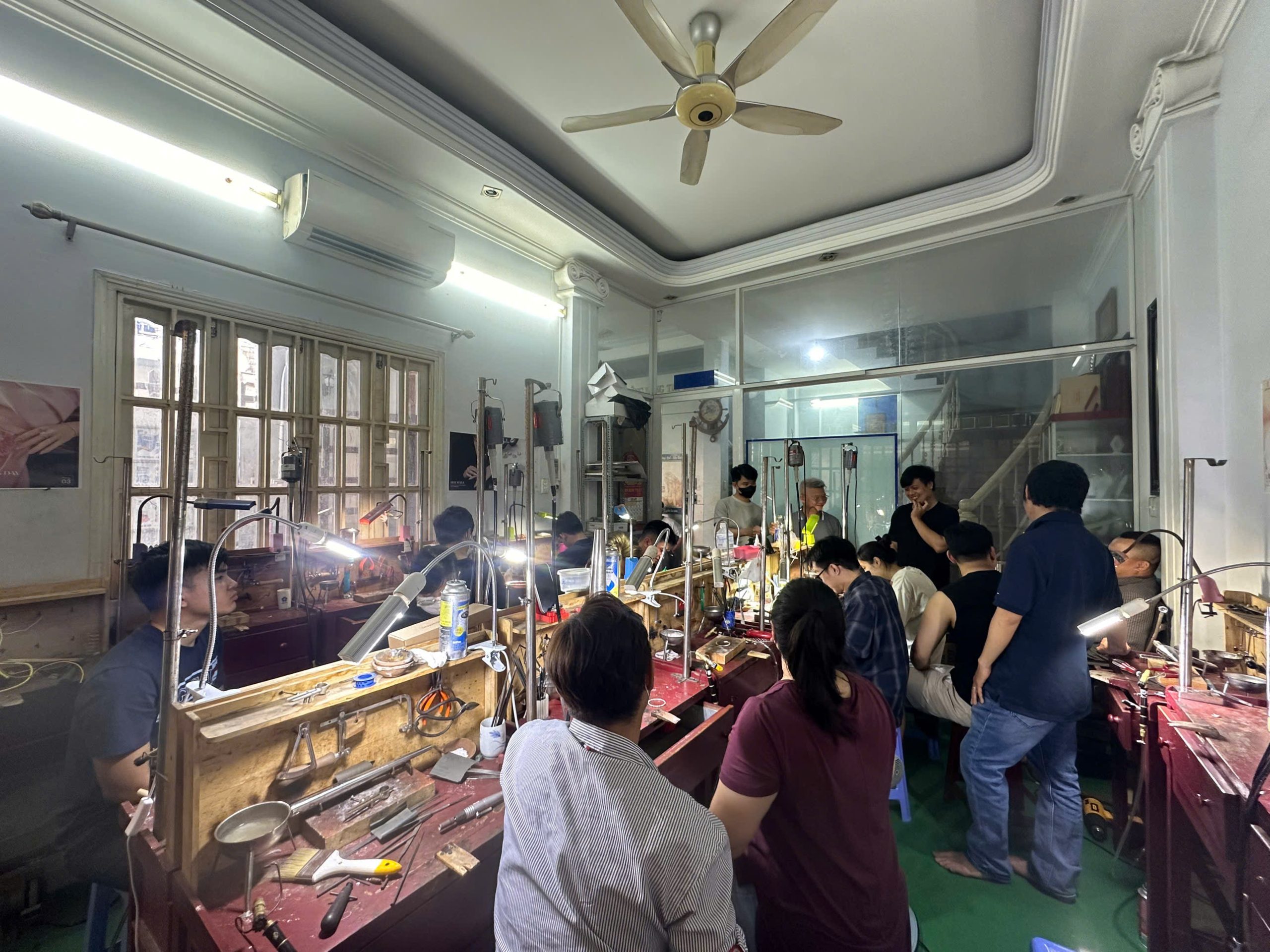 – Làm việc trong phòng có hệ thống hút khói, thông gió. Xưởng chế tác nên có máy hút bụi, hút khói hàn, và hệ thống thông khí tốt. Để đảm bảo không khí trong lành, tránh khí độc tích tụ.